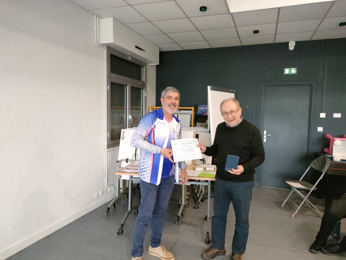 Après quelques questions et la parole donnée aux invités, la réunion s'est conclue sur la remise de deux médailles d'argent du dirigeant de la FFTA à Michel et Xavier, pour honorer leurs engagements variés depuis de nombreuses années au profit de l'association en particulier mais aussi plus largement au profit du Tir à l'arc ! 👏👏
