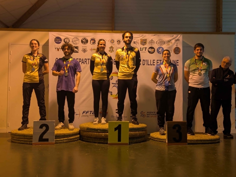 En matinée du samedi 24, notre représentant S3 arc classique a brillé et s'adjuge une 3e place bien méritée lors de son parcours. En effet, Guillaume, après un 1er tour gagné "à vide" au regard des qualifications, il a su se motiver pour le 2e tour qui était assez mal parti et a réalisé une véritable "remontada" pour s'imposer. Puis il gagne son duel suivant 7-3 et se retrouve en petite finale, qu'il parviendra, après un peu de suspens, à remporter. Il se retrouve donc 3e départemental pour ce millésime, derrière 2 archers bien connus des Archers de la Lande, puisqu'ils sont régulièrement sur les 2 plus hautes marches du podium lors de notre concours salle :)
