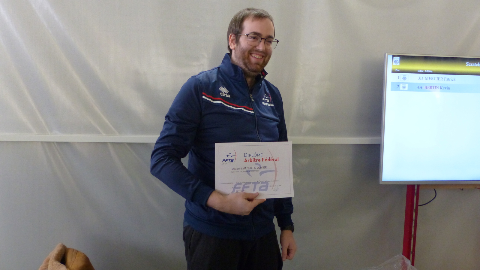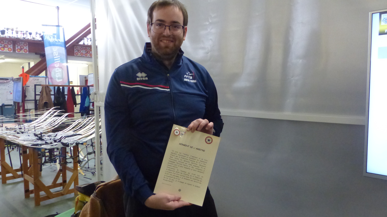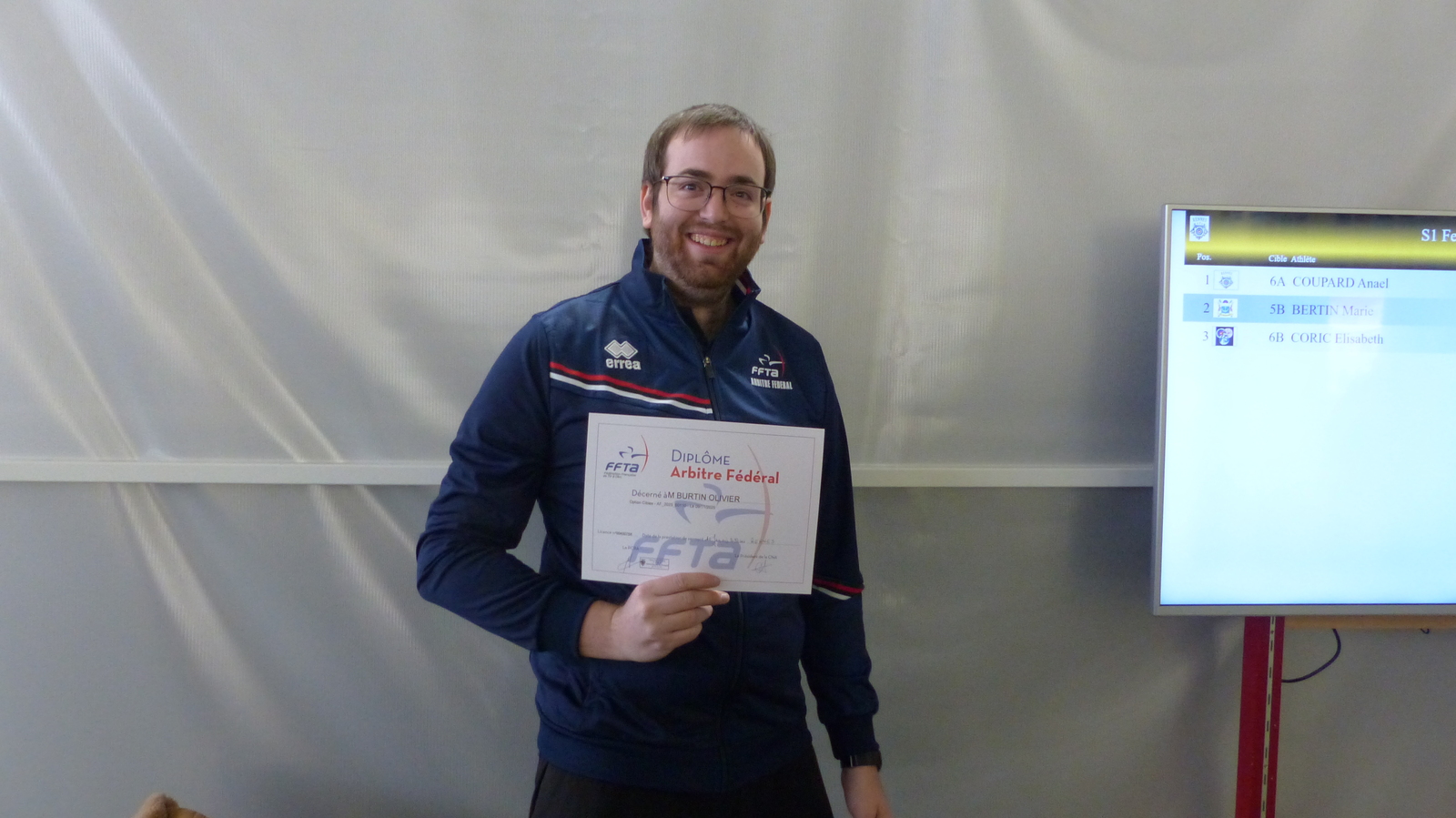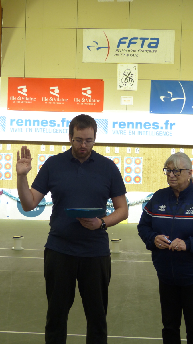 Seul nouvel arbitre d'Ille et Vilaine avec l'option "Cibles" de ce millésime, il a été invité a prononcé son serment par Marie-Pierre, responsable des arbitres de la région Bretagne. Après la signature du procès-verbal par Marie-Pierre et Olivier, il devient officiellement un des arbitres de la FFTA.